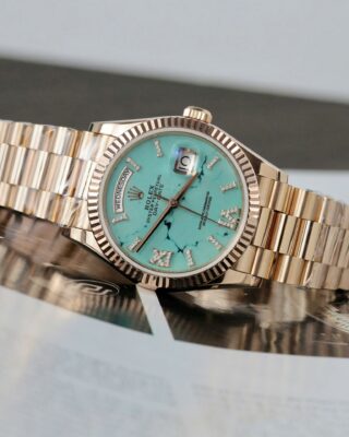 Looking for a Rolex Day-Date replica that actually looks and feels like the real thing? The Superclone Rolex Day-Date Turquoise Dial 128235 40 mm is one of our most popular Day-Date models — and for good reason. It features a turquoise set with cz diamonds dial, a stainless steel & everose gold plated case (40mm), and an automatic movement that keeps accurate time day after day.